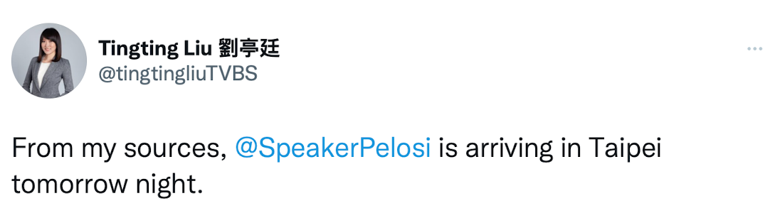 Тайваньская журналистка Тинтин Лю пишет, что, по данным ее источников, спикер Палаты представителей США Нэнси Пелоси прибудет на Тайвань завтра. Об этом она сообщила на своей странице в Твиттере.