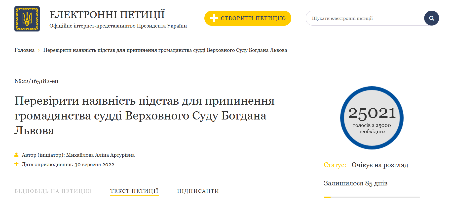 Петиция о лишении гражданства Председателя Кассационного хозяйственного суда в составе Верховного суда Украины Богдана Львова, у которого нашли российский паспорт в рекордные сроки, менее чем за 5 дней набрала необходимые 25 тысяч подписей.