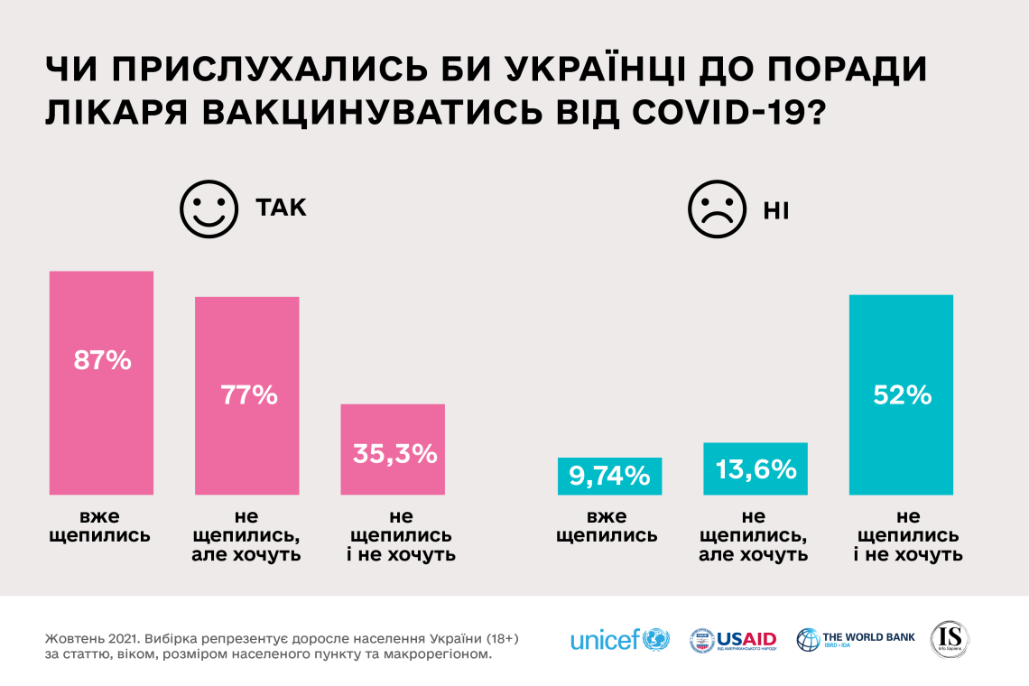Также исследование ЮНИСЕФ показало, что 42 украинца, которые до сих пор не вакцинировались от COVID-19, готовы пройти курс прививки.