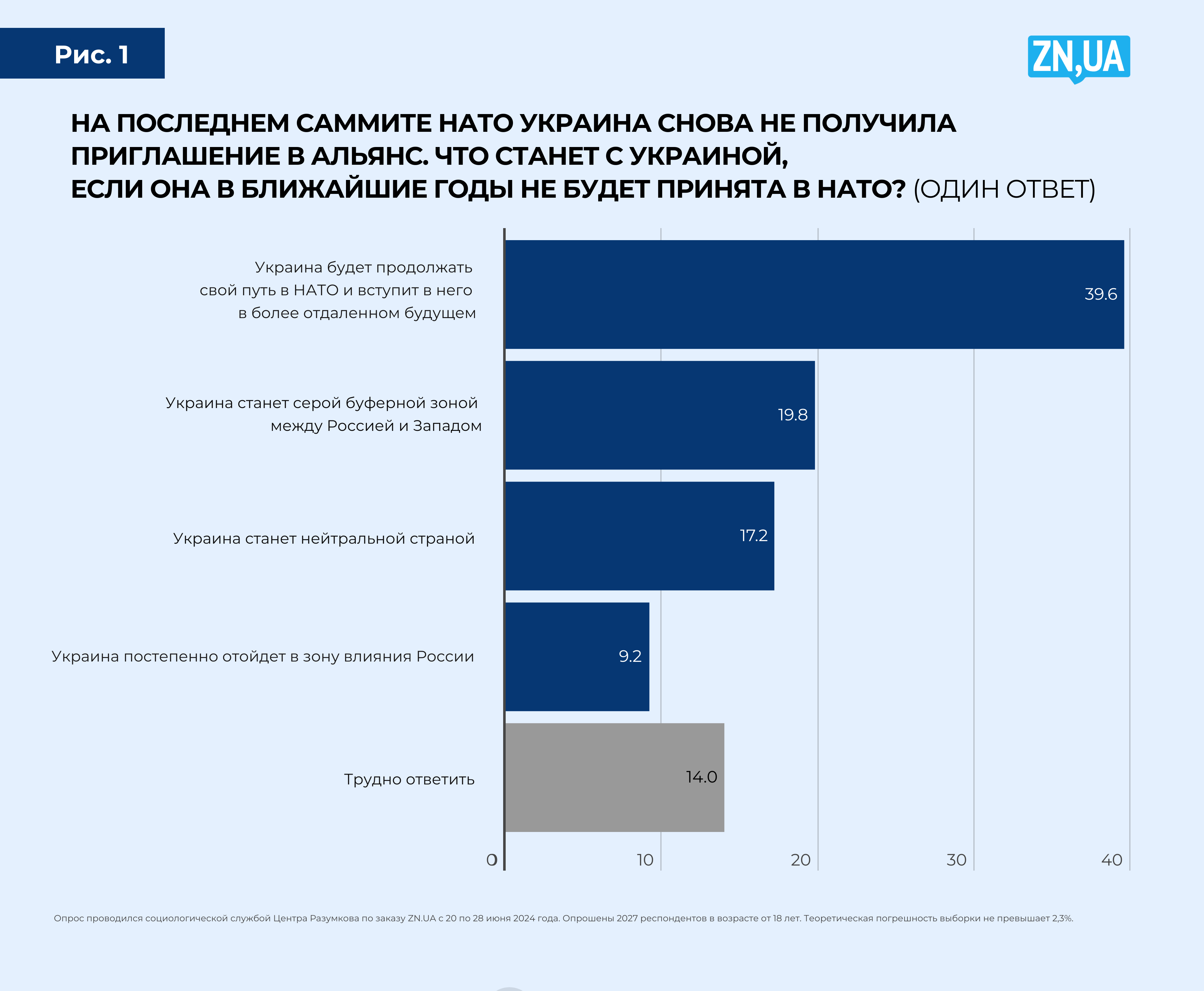 В то же время 39,8% опрошенных остаются оптимистами, потому что убеждены, что Украина продолжит свой путь в НАТО и присоединится к Альянсу в будущем. Примечательно, что такие надежды больше лелеют на западе Украины (51,2%), чем на востоке (27,8%).
