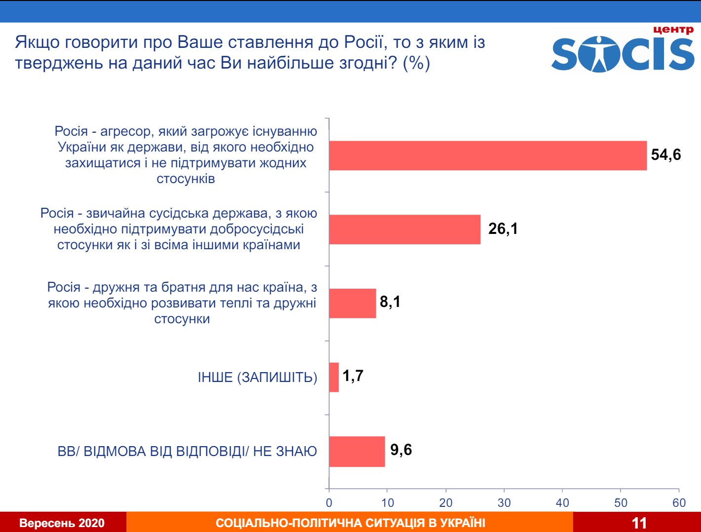 Более половины украинцев (54,6%) считает, что Россия является страной-агрессором, которая угрожает существованию Украины как государства, от которого необходимо защищаться и не поддерживать никаких отношений. Об этом свидетельствуют данные социологического исследования "Социс".