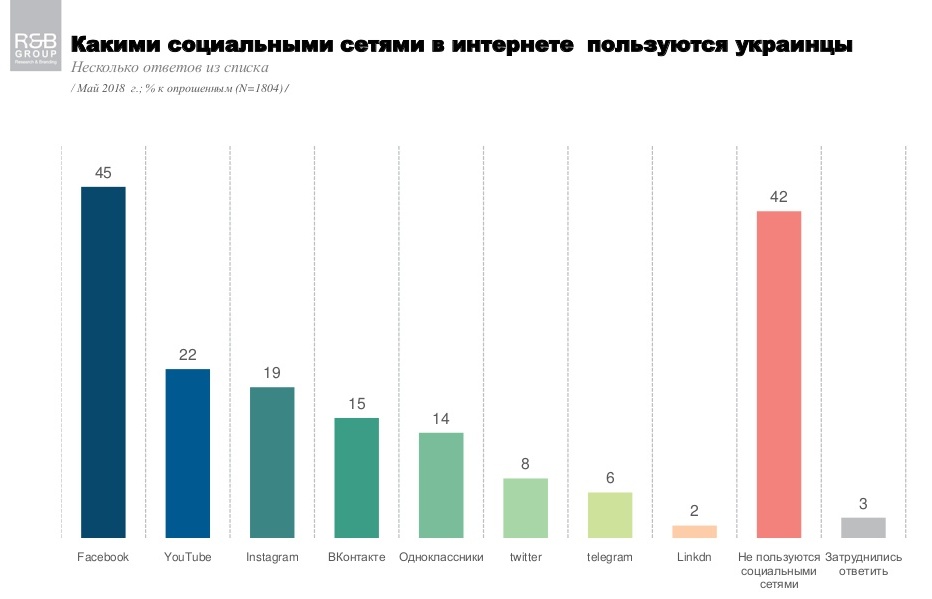 В настоящее время более половины украинцев (55%) являются пользователями тех или иных соцсетей, многие пользуются сразу несколькими. Наибольшее число пользователей в Украине приходится на Facebook (45%), свидетельствуют данные опроса компании Research & Branding Group, проведенного в мае 2018 года.