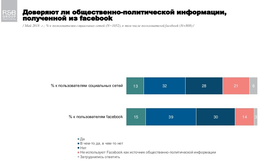 Полностью доверяют общественно политической информации в Facebook 15% пользователей; частично доверяют, частично нет – 39%; совсем не доверяют 30% пользователей Facebook.