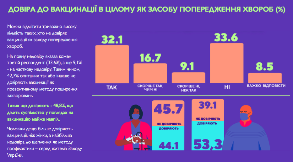 Отмечается, что еще 9,1% частично не доверяют вакцинации. 42,7% опрошенных так или иначе не доверяют вакцинации как превентивному методу распространения заболеваний. Больший уровень недоверия зафиксирован среди женщин.