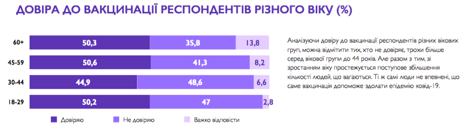 Тех, кто не доверяет вакцинации, больше среди возрастной группы до 44 лет. Однако в результатах исследования прослеживается постепенное увеличение количества людей, колеблются.