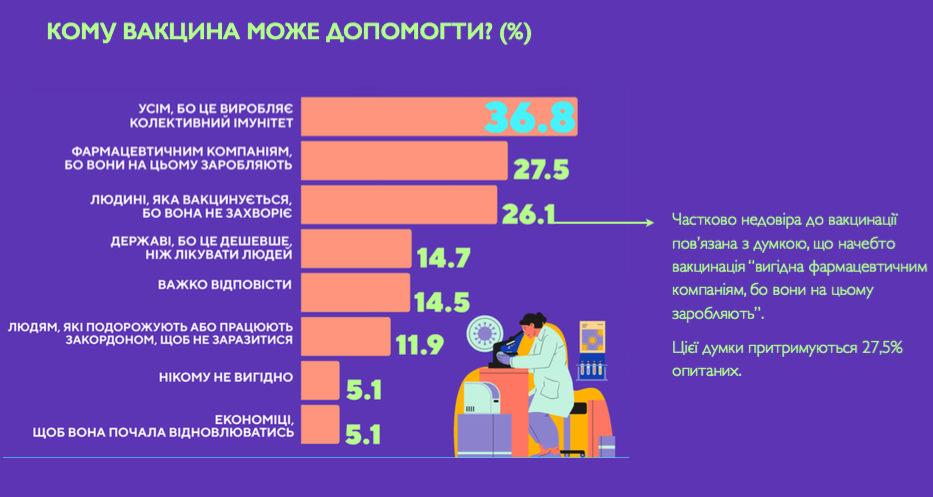 27,5% украинцев считают, что вакцинация выгодна фармацевтическим компаниям, потому что они на этом зарабатывают. Чуть меньше - 26,1% - считает, что вакцинация поможет человеку, потому что он не заболеет.