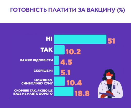 Если говорить о платной вакцинации, то 51% опрошенных не готов платить вообще за процедуру, еще 5,1% - скорее откажутся. При этом 10,4% согласились бы только на символическую оплату.