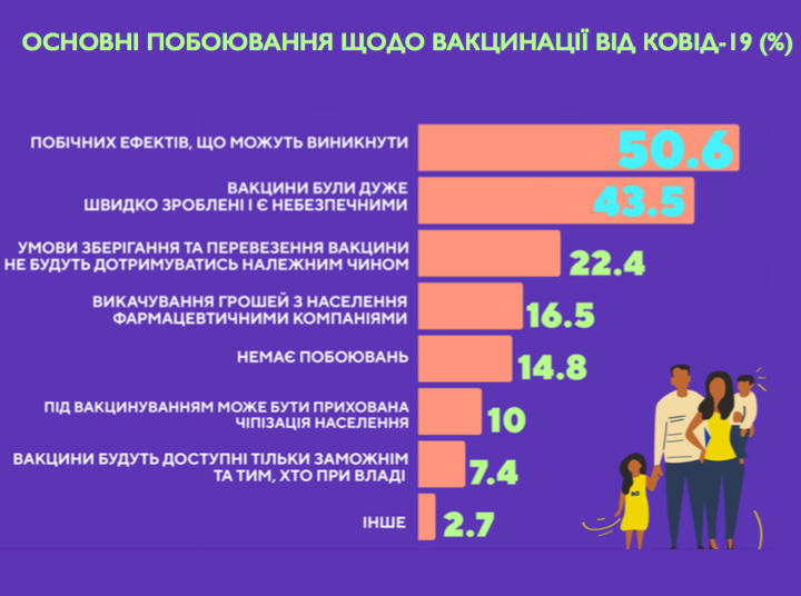 Больше всего людей опасается вакцинации из-за побочных эффектов; того, что вакцина была сделана слишком быстро и того, что условия хранения не будут соблюдены.
