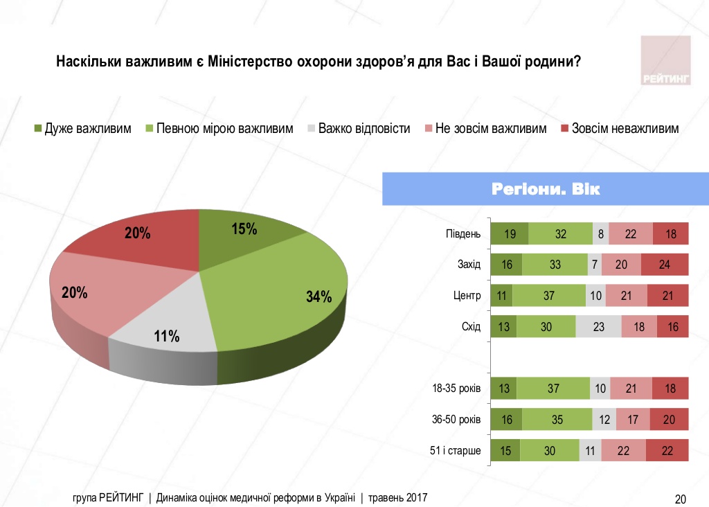Больше всего тех, для кого министерство имеет значение на Юге, меньше всего - на Востоке. Для старших министерство является несколько более важным, чем для младших респондентов. Для граждан в возрасте 18-35 лет Минздрав является важной структурой для 40%, а для 41% - бесполезной.