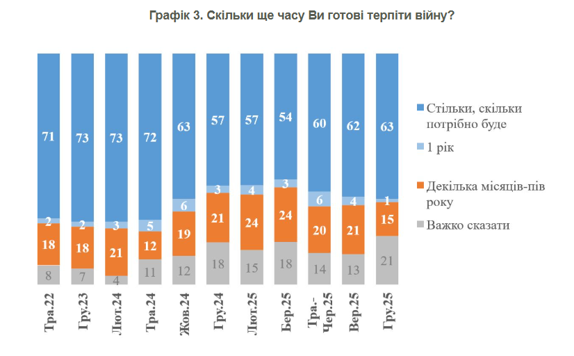 В то же время большинство украинцев - 63% - заявили, что они готовы терпеть войну столько, сколько нужно, а еще 1% заявляют, что готовы терпеть около года.