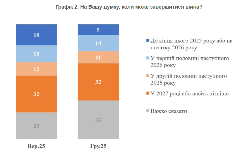 При этом только 9% украинцев ожидают, что война завершится до начала 2026 года и лишь 14% думают о ее возможном завершении хотя бы в первой половине 2026 года. Еще 11% говорят о возможном завершении войны во второй половине 2026 года, 32% говорят о 2027 году и позже. В то же время каждый третий респондент ответил "не знаю".