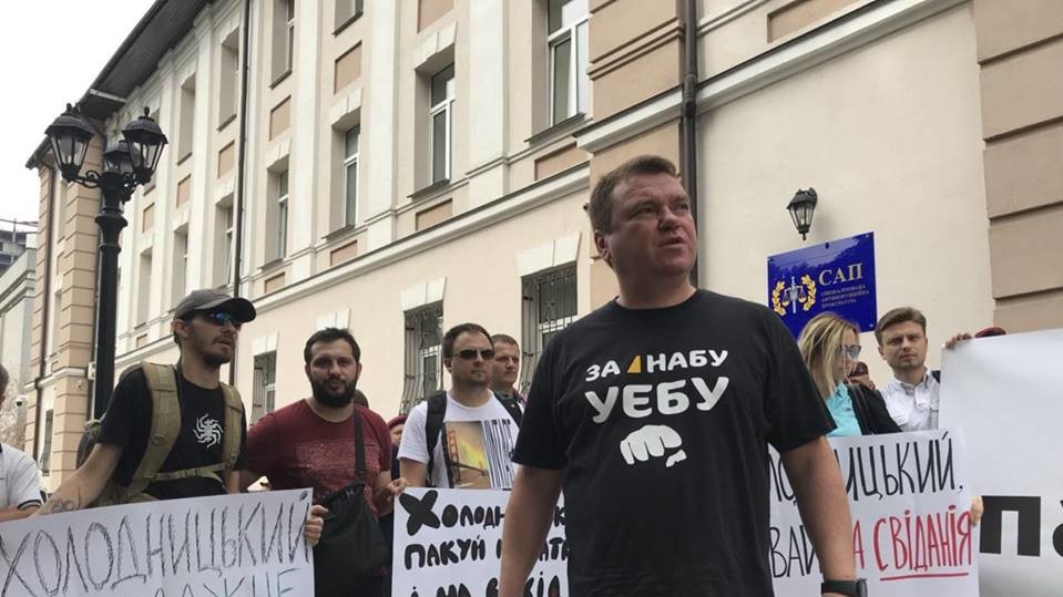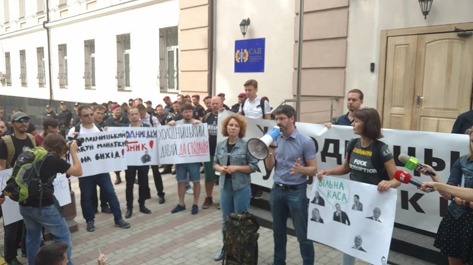 Под зданием Специализированной антикоррупционной прокуратуры сегодня, 17 июля, собрались две акции протеста. В частности активисты Центра противодействия коррупции требуют отставки руководителя САП Назара Холодницкого, а группа пенсионеров с флагами Социалистической партии виступает на его поддержку.
