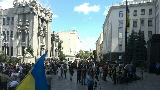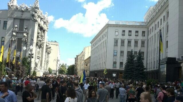 Возле Администрации президента утром в воскресенье, 29 июня, собрались сотни людей, которые протестуют против перемирия, объявленного на Востоке, и выступают за возобновление АТО.