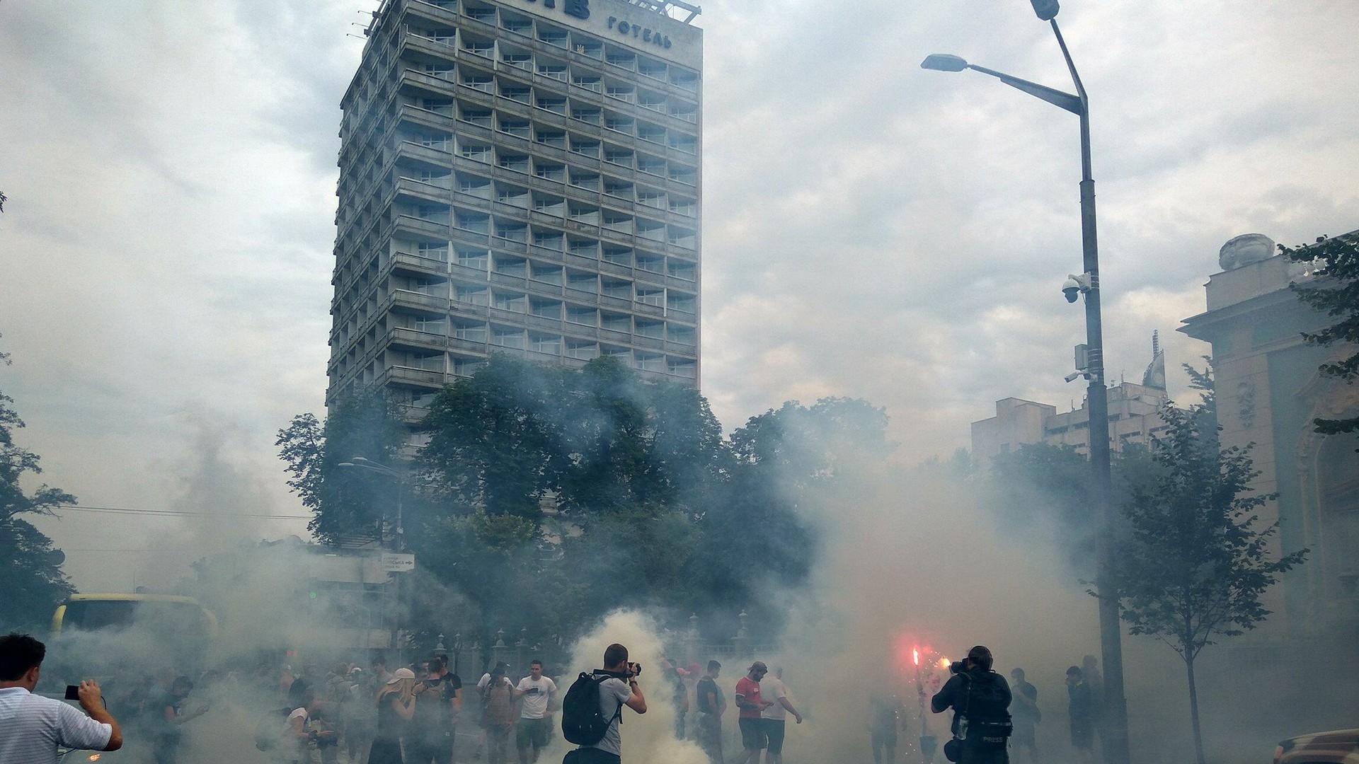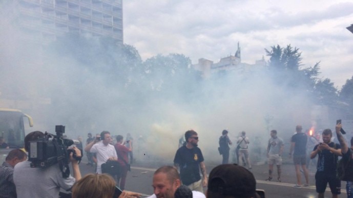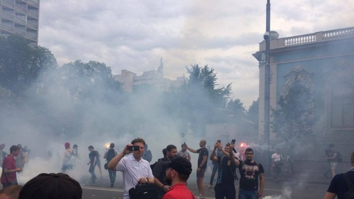 Участники митинга стучат в бочки и жгут файеры.