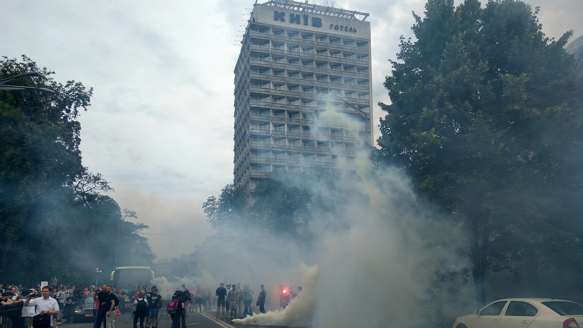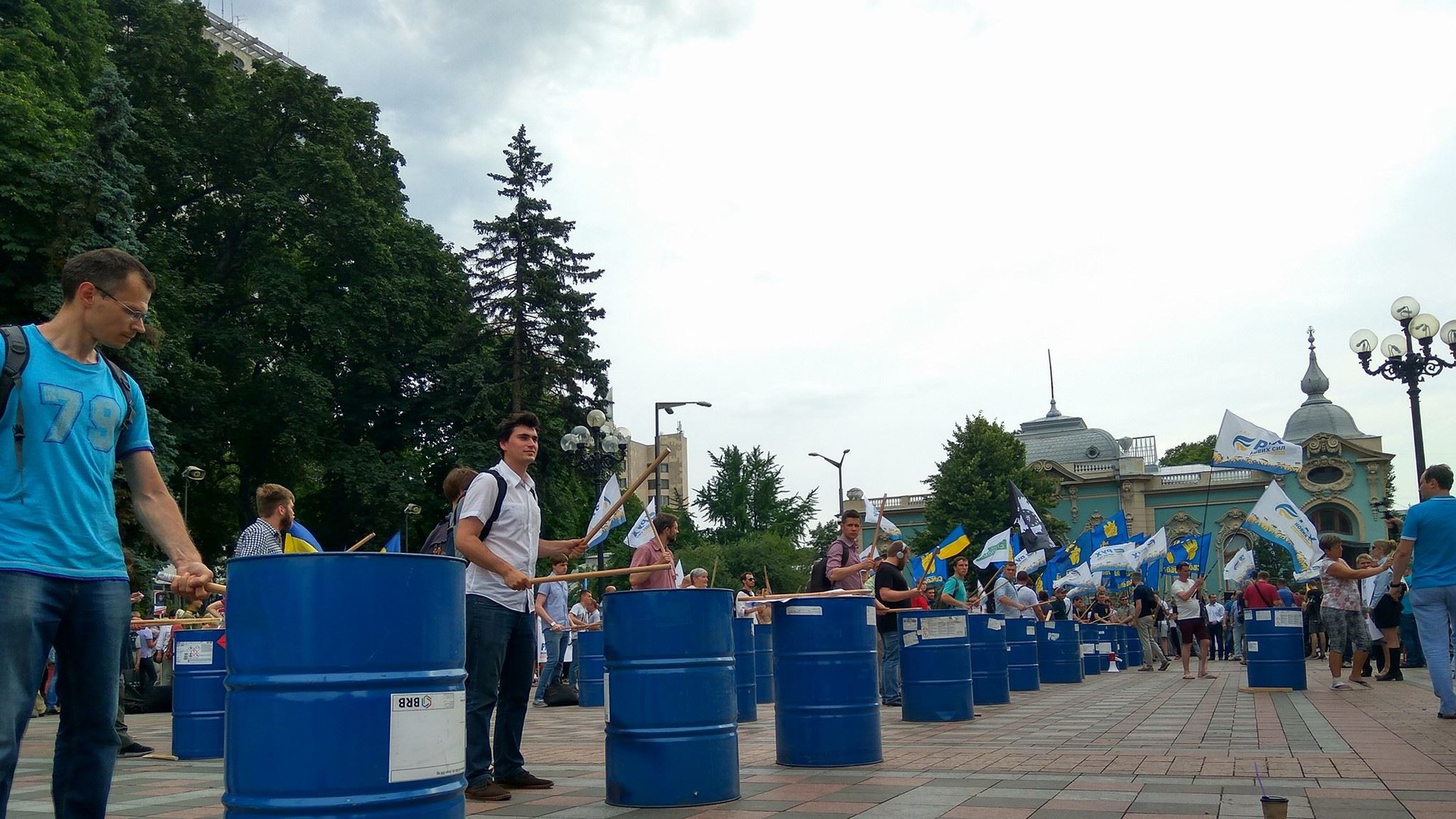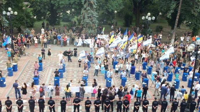 Митингующие пришли с различными флагами "Движение новых сил", "Самопомощь" и "Свобода". Под Радой присутствуют и члены "Центра противодействия коррупции", а также "Центр UA".