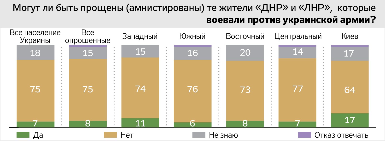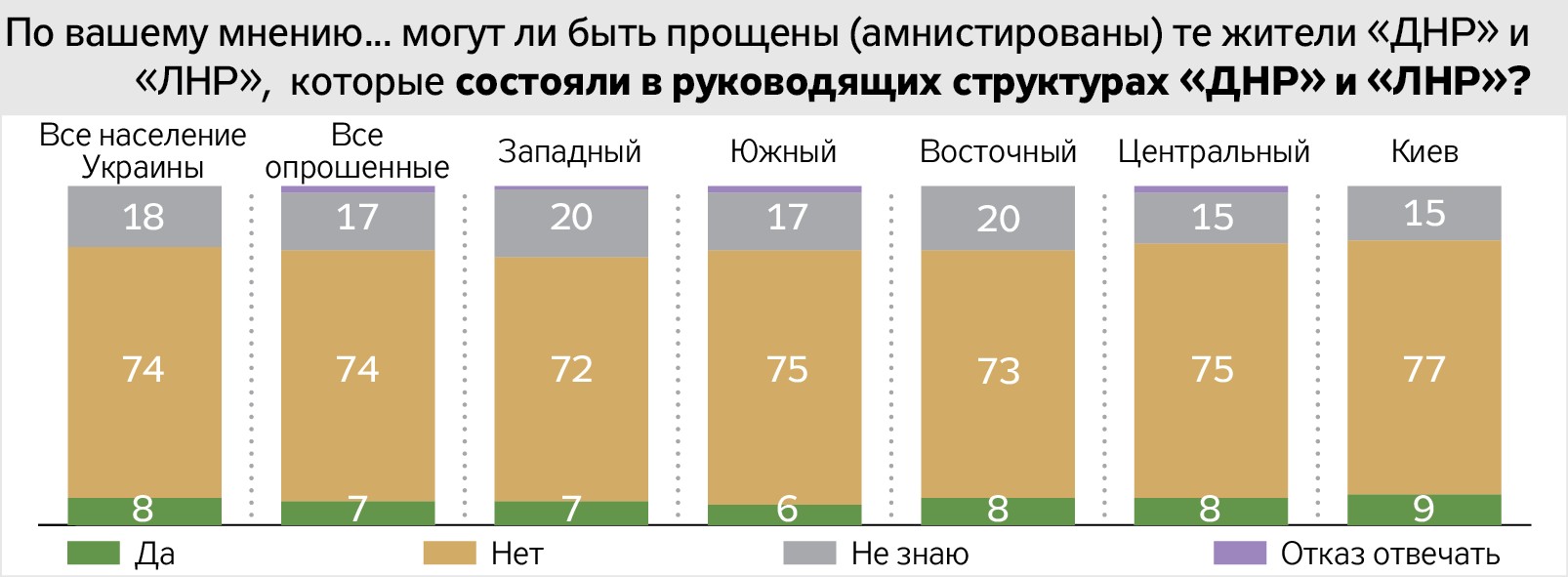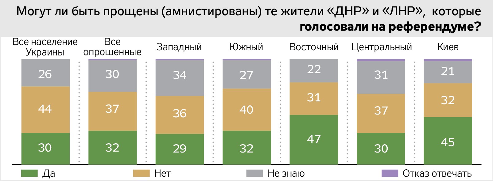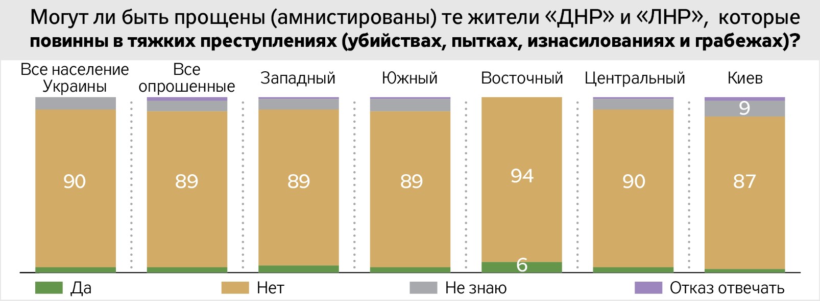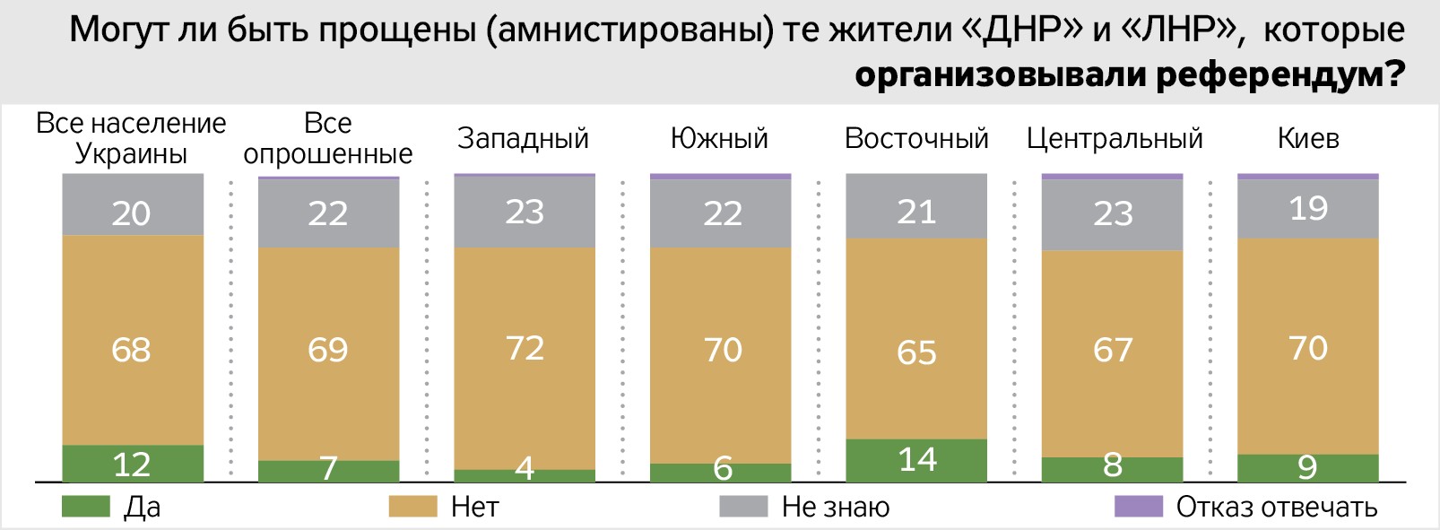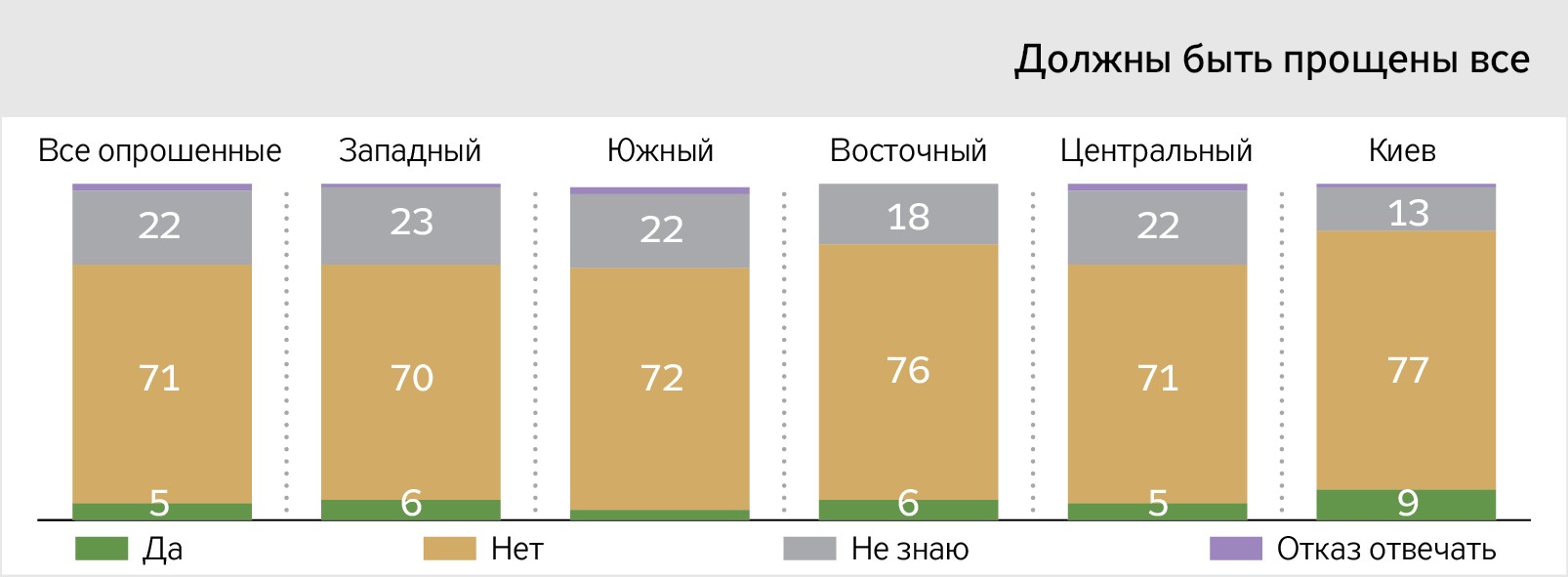 Подавляющее большинство родственников погибших бойцов уверено: не могут быть прощены лица, повинные в тяжких преступлениях, совершенных в ходе войны. Две трети опрошенных считают, что не заслуживают прощения (амнистии) те, кто воевал против украинских военных. Почти столько же не считают возможным прощать верховодов псевдонародных республик. Абсолютное большинство выступает за наказание организаторов референдума.