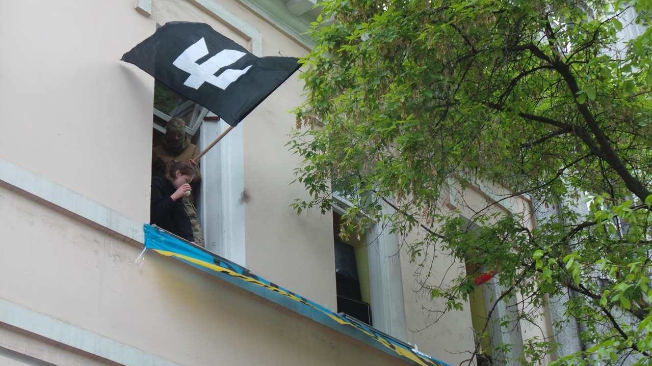 Из окна офиса организации размахивают флагами, также была брошена дымовая шашка. На месте работает следственно-оперативная группа.