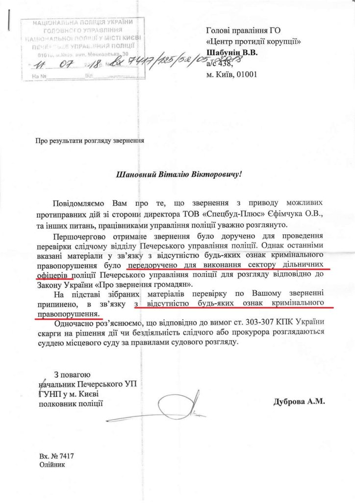Кроме того, полиция охарактеризовала заявление о преступлении по "обращению граждан" и перекинула дело на участковых инспекторов, которые занимаются бытовыми кражами, а не подделкой документов в тендерах на сотни миллионов гривен.