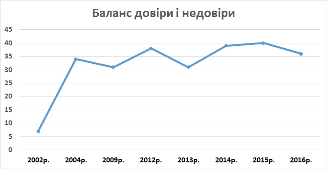 Уровень доверия к социологическим исследованиям за год не изменился, уровень недоверия немного повысился, поэтому баланс доверия и недоверия (процент тех, кто доверяет, минус процент тех, кто не доверяет) немного уменьшился (с 40% до 36%) в сравнении с аналогичным исследованием декабря 2015 года.