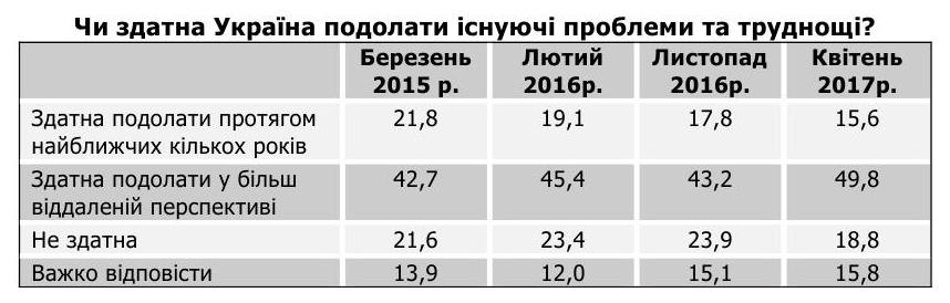 Вместе с тем, по сравнению с 2016 годом уменьшилась доля тех, кто считает, что Украина вообще не способна их преодолеть (с 23% в феврале 2016 года и 24% в ноябре 2016 года до 19% в апреле 2017 года).
