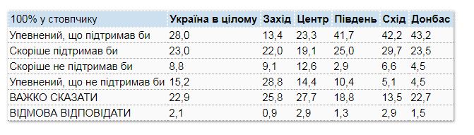 На вопрос "Если бы для прекращения боевых действий и мирного урегулирования конфликта на Донбассе нужно было предоставить автономию в составе Украины неподконтрольным территориям Донецкой и Луганской областей (ДНР и ЛНВ), поддержали бы Вы такое предложение?" 51% украинцев ответили, что скорее или точно поддержали бы такое предложение (в т.ч. точно поддерживают – 28%), не поддержали бы – 24% (в т.ч. точно не поддержали бы – 15%). Еще 25% респондентов затруднились или отказались ответить на вопрос.