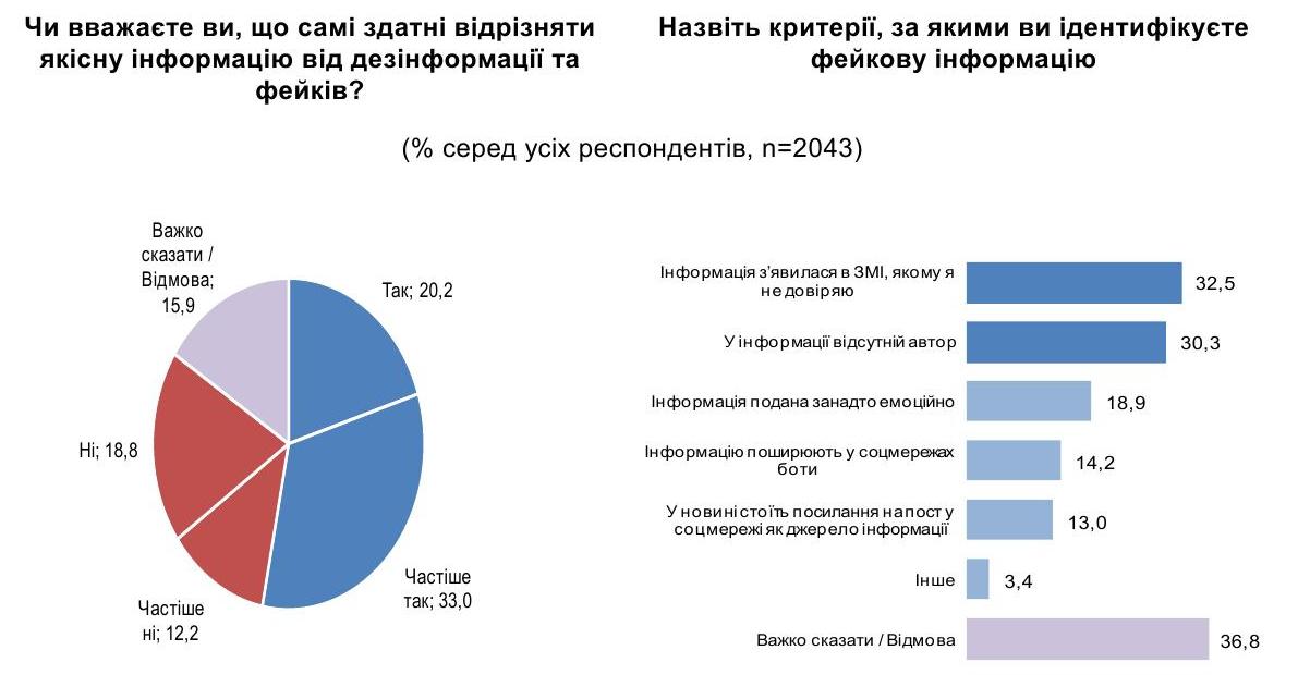 Среди критериев идентификации фейков чаще других назывались доверие к СМИ, в котором появилась информация (для 33% жителей Украины это один из основных критериев), и наличие автора (30%).