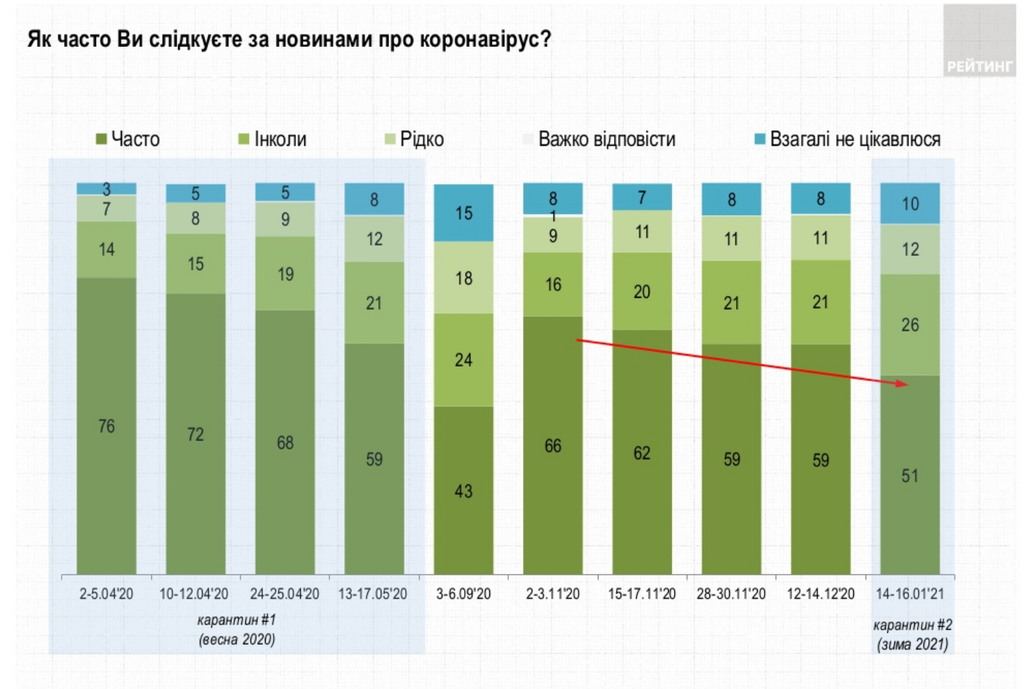 Несмотря на то, что эпидемия в Украине продолжаются почти год, новостями о коронавирусе продолжает интересоваться половина украинцев (51%). Об этом свидетельствуют результаты опроса Социологической группы «Рейтинг» , проведенного в течение 14-16 января 2021 года.