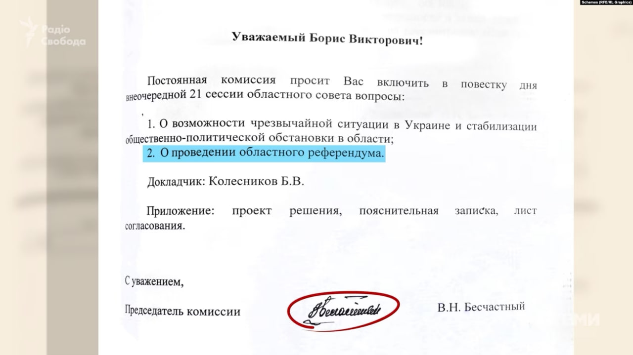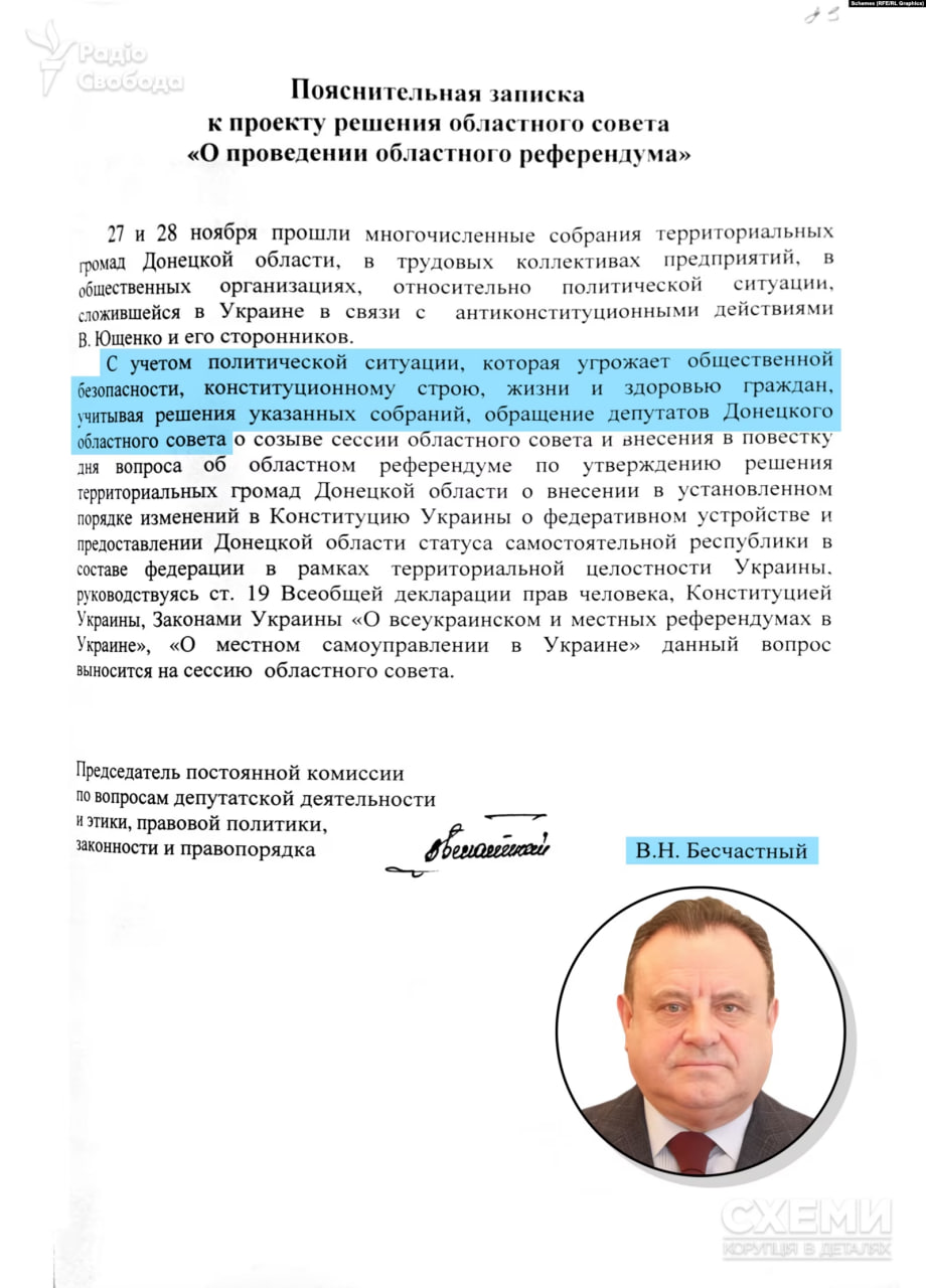 Оказалось, что Бесчастный даже написал объяснительную записку, в которой обосновал необходимость проведения фейкового «референдума». В частности, в ней говорилось, что вопросы выносят на областную сессию «с учетом политической ситуации, угрожающей общественной безопасности, конституционному строю, жизни и здоровью граждан, учитывая собрание территориальных громад и обращение депутатов Донецкой облрады».