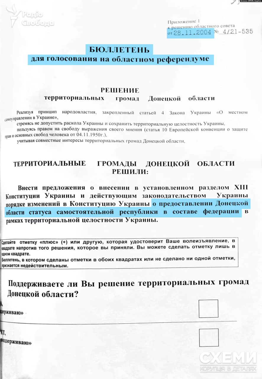 Во время внеочередного заседания Донецкой областной рады депутаты проголосовали за проведение референдума 5 декабря 2004 года. В частности, такое «голосование» могло бы позволить региону получить особый статус.