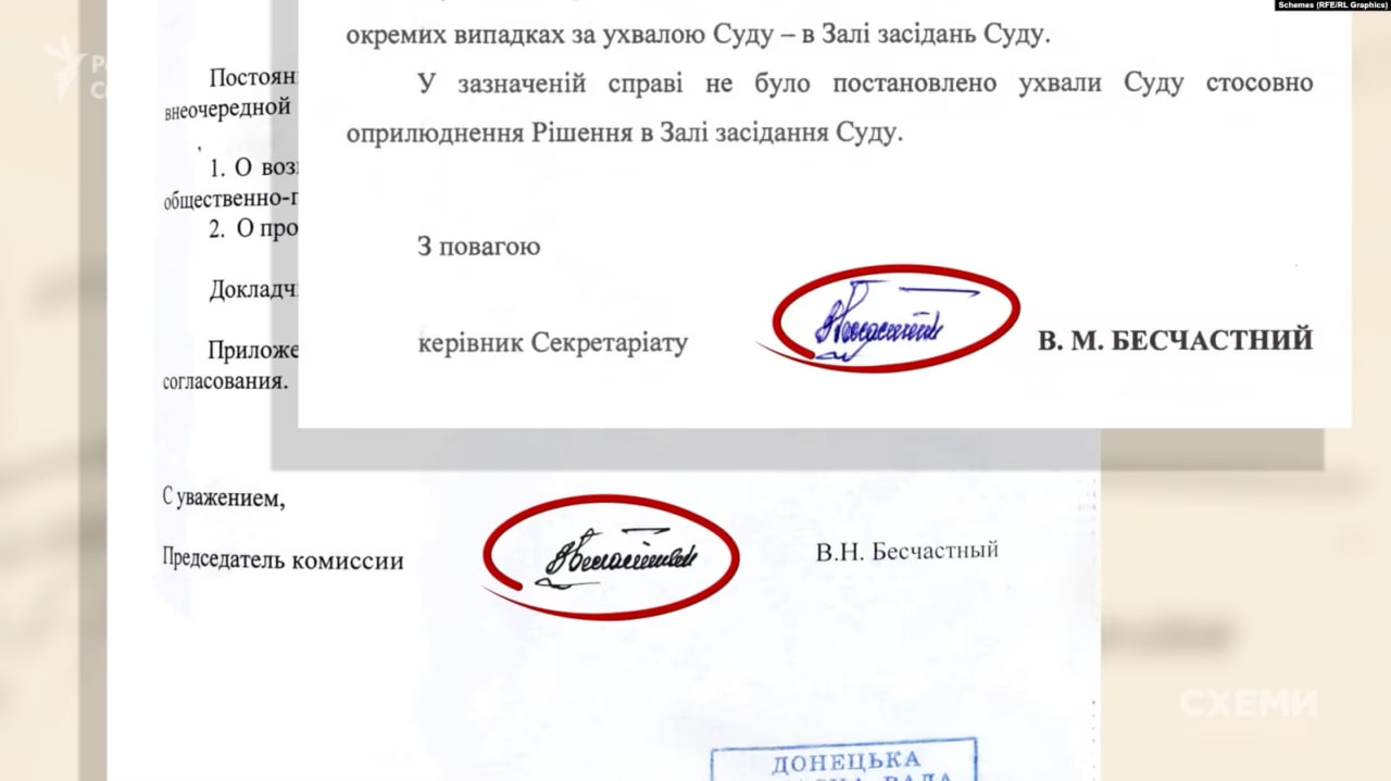 Однако в «Схемах» отметили, что сопоставили подпись Бесчастного под документами 2004 года и ту, что он ставит уже в статусе руководителя секретариата КСУ. Подписи совпадают.