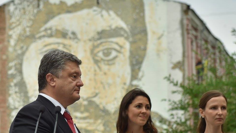 "Знаменитый стрит-арт художник из Португалии Алешандре Фарту, который сейчас здесь среди нас, подарил нам это великолепное графическое панно. Меня очень поразили глаза Сергея. Приглядитесь к ним, когда мы их откроем. Я рад, что это не была протокольная инициатива государства, это настоящая инициатива общественности, настоящих граждан Украины", - сказал Порошенко.