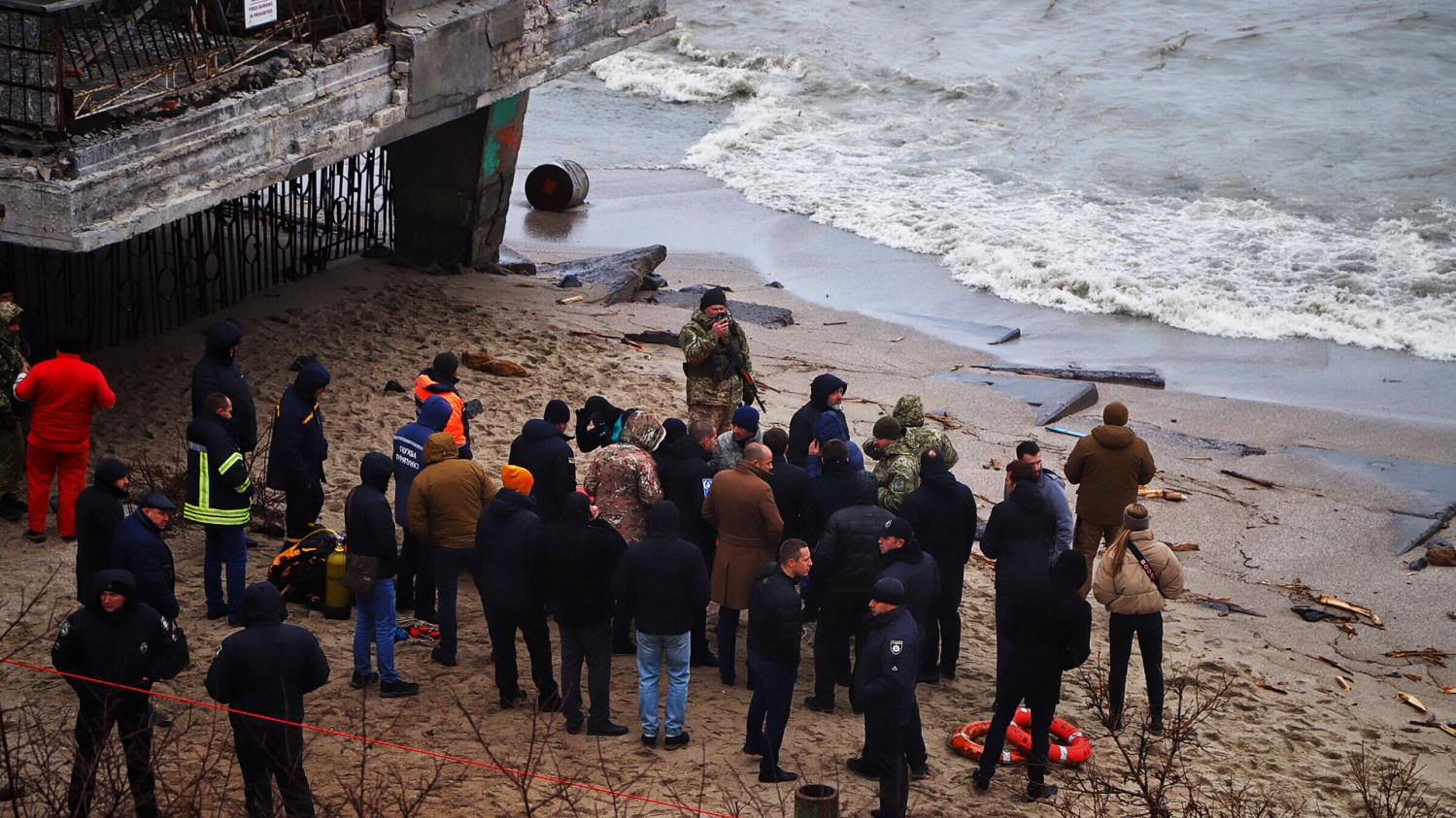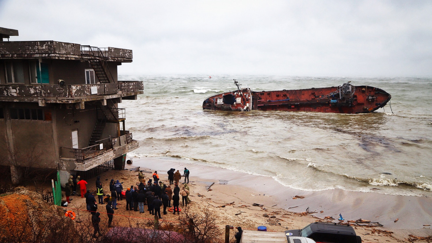 Танкер "Делфи", который потерпел бедствие возле берегов Одессы, перевернулся на бок и с него вытекает горючее. На фоне сильного шторма украинские спасатели пытаются достать из воды трех членов экипажа, сообщает "Думская".