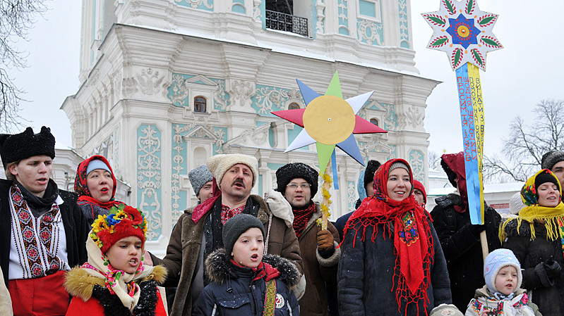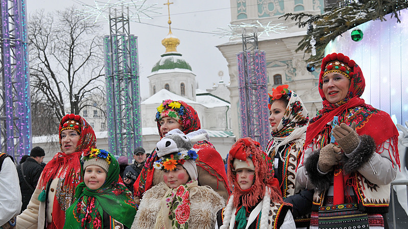 На Софийской площади в Киеве с утра, 7 января, проходили праздничные рождественские мероприятия. Колядники в традиционных костюмах разыгрывали театральные представления, кто- то даже привел живую козу. Желающие могли приобрести у торговцев рождественские пряники и сувениры.