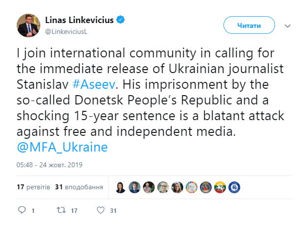 "Я присоединяюсь к международному сообществу и призываю немедленно освободить украинского журналиста Станислава Асеева. Его задержание так называемой "Донецкой народной республикой" и шокирующий 15-летний тюремный срок является вопиющей атакой на свободные и независимые средства массовой информации", – написал Линкявичюс.