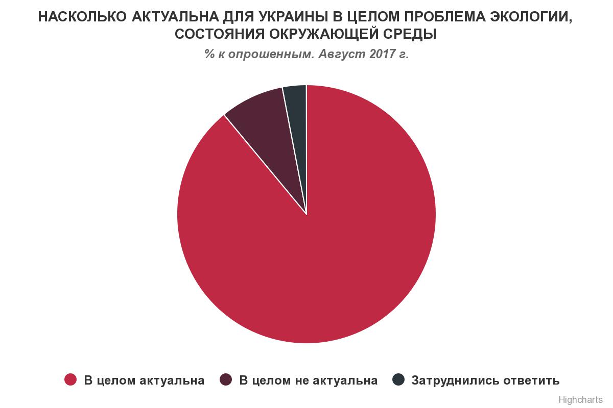 В августе 2017 года подавляющее большинство украинцев (89%) считают проблемы экологии и состояния окружающей среды актуальными для страны, причем, по мнению 44% украинцев эти проблемы в масштабах Украины крайне актуальны, свидетельствуют данные опроса Research & Branding Group.