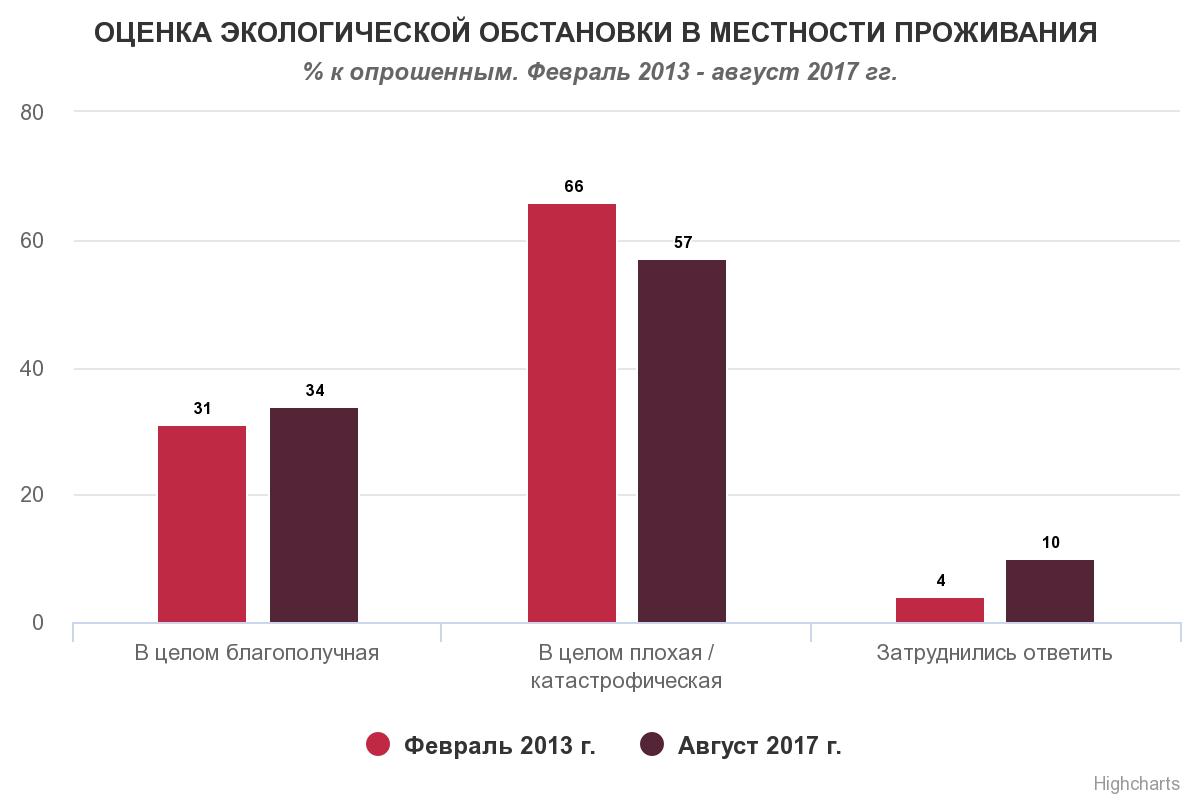 Плохой и катастрофической экологическую ситуацию в своей местности считают более половины украинцев (57%), тогда как благополучной – только треть (34%). Если сравнивать с ответами на аналогичный вопрос в феврале 2013 года, то число тех, кто оценивал экологическую ситуацию как критическую, уменьшилось на 9%, а число затруднившихся с оценкой увеличилось на 6%.