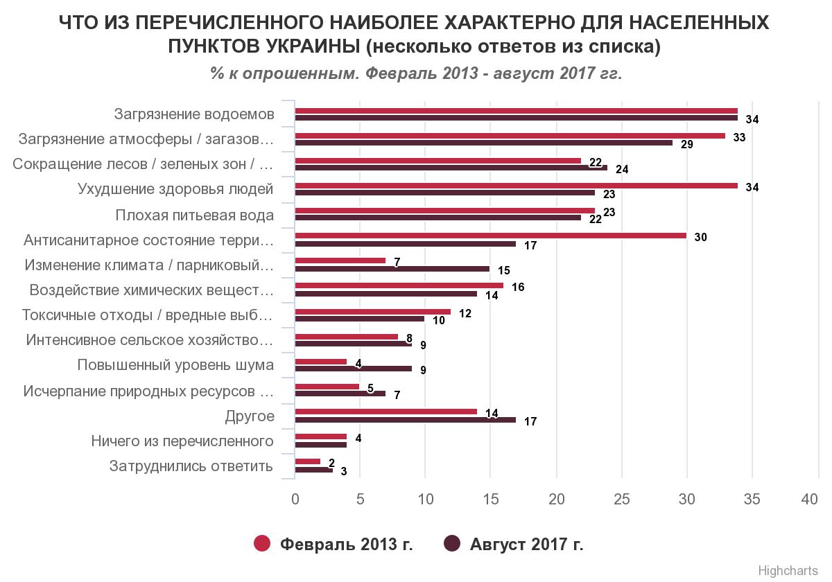 В сравнении с 2013 годом данный перечень остался практически неизменным, за исключением того, что заметно сократилось число украинцев, которые назвали характерными для своей местности ухудшение здоровья людей (на 11%) и антисанитарное состояние территорий (на 13%). При этом на 8% увеличилось число отметивших изменение климата и парниковый эффект.