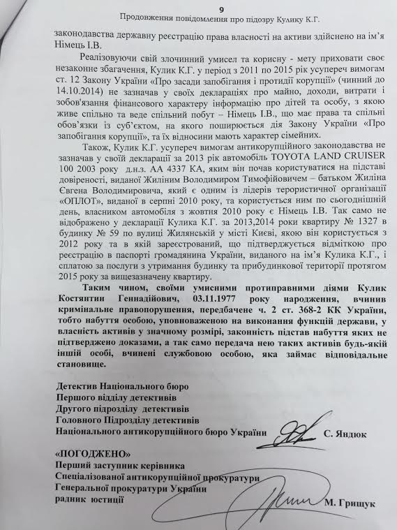 Об этом стало известно из копии документа о предъявлении подозрения Кулику, текст которого опубликовала "Украинская правда". В подозрении также упоминается гражданская жена Кулика – Ирина Нимец.
