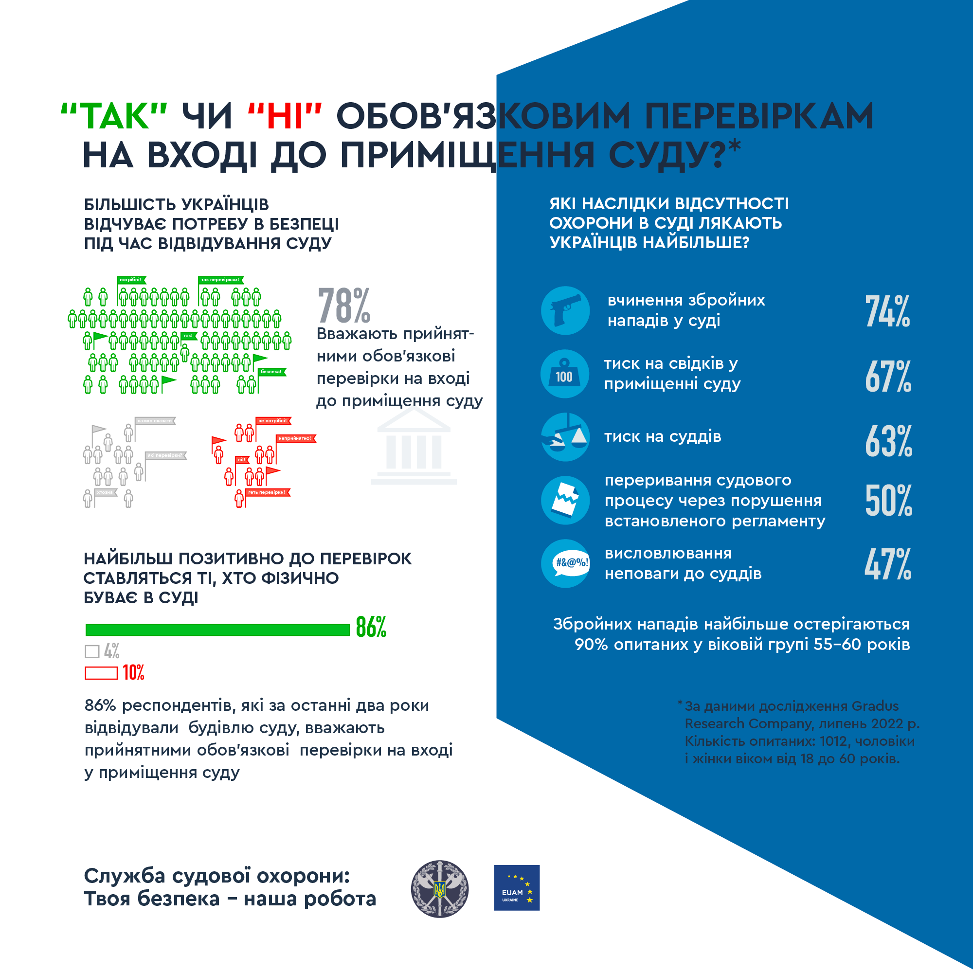 "До 74% украинцев опасаются риска вооруженного нападения из-за недостаточной безопасности в судах. Огромное количество стрелкового оружия и опасных предметов, так и не попавших в зал судебных заседаний, поразило нас и заставило осознать важность обеспечения безопасности каждого человека в судах", - заявила Маура О'Салливан, руководитель аппарата Консультативной миссии Европейского Союза (КМЕС) в Украине.