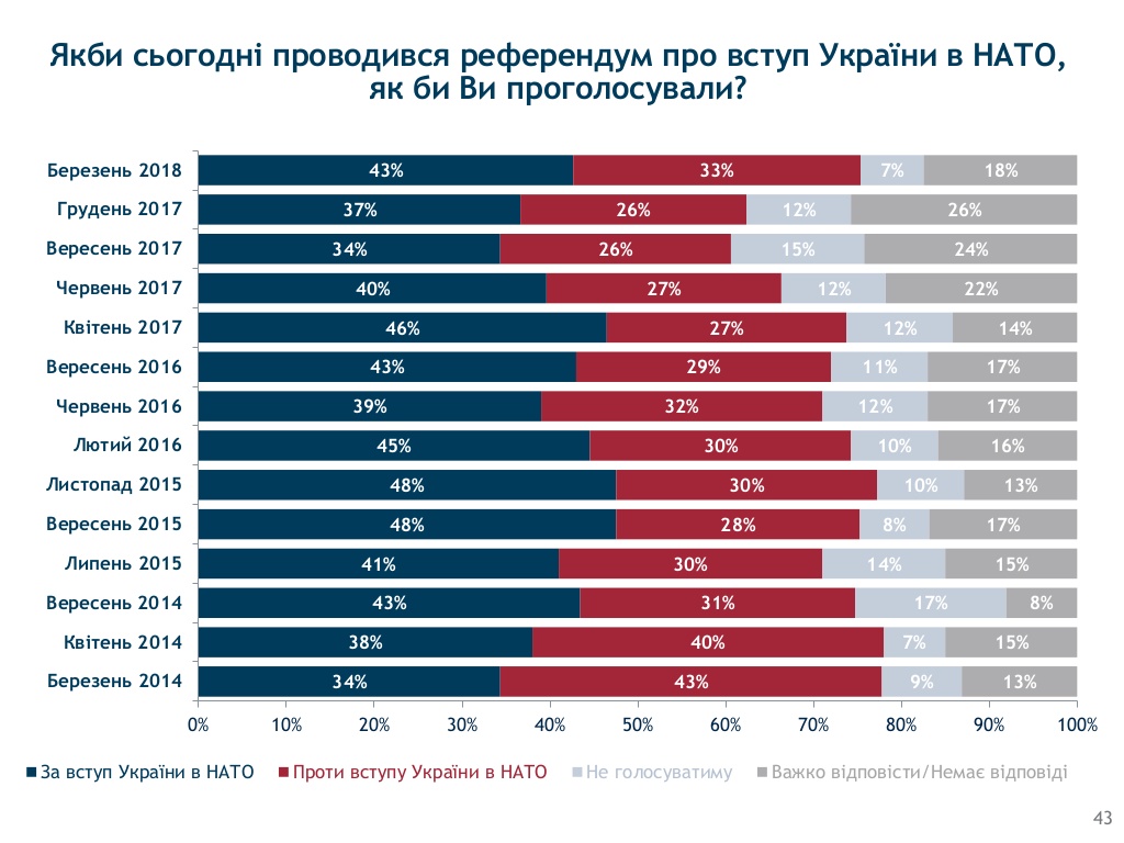 Если бы в Украине проводился референдум о вступлении в НАТО, 43% граждан проголосовали бы за, 33% - против, остальные либо не определились, либо не пришли бы на участки, свидетельствуют данные опроса Социологической группы "Рейтинг", проведенного в марте по заказу Международного республиканского института (IRI).