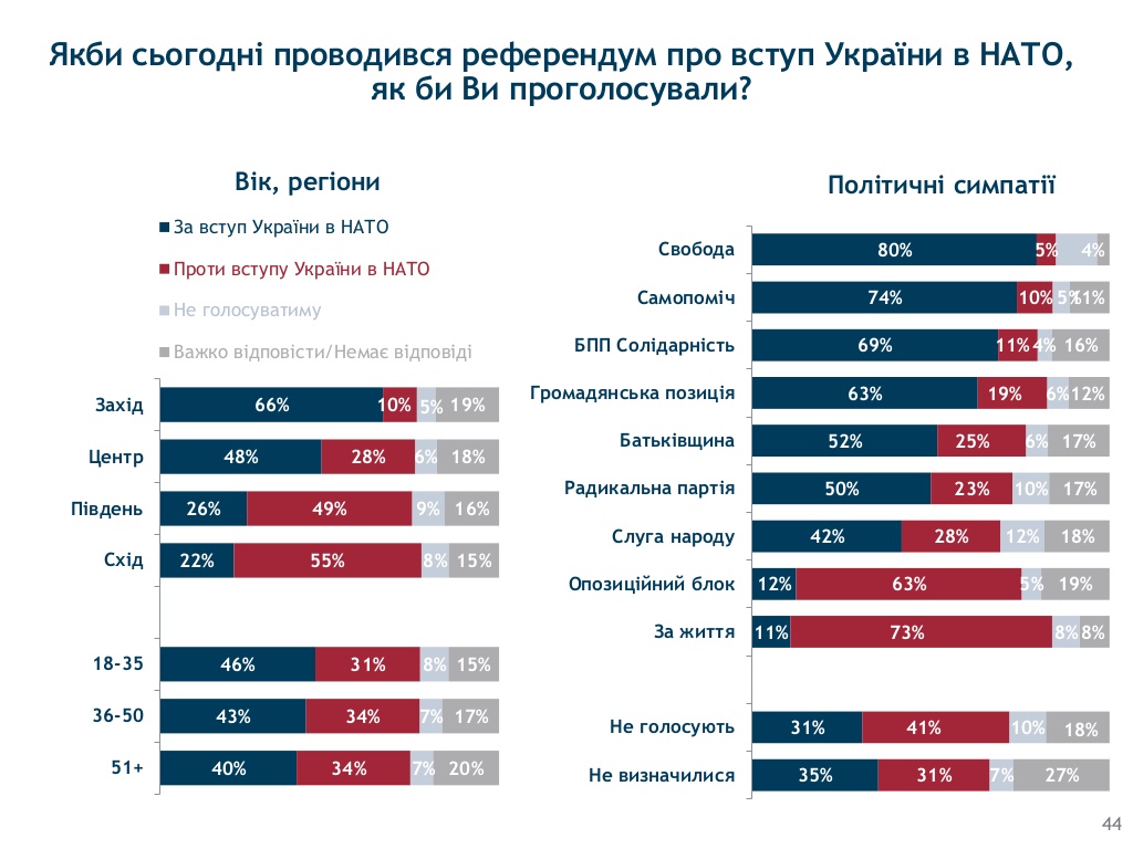 Среди сторонников политических партий выступает против вступления в НАТО только электорат партии "Оппозиционный блок" (12% - за, 63% против) и партии "За життя" (11% - за, 73% против).