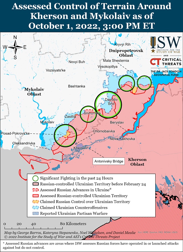 «Украинские и российские источники постоянно указывают на то, что российские войска продолжали укреплять российские позиции в Херсонской и Запорожской областях, несмотря на недавнее сворачивание фронта Харьков-Изюм и даже после уничтожения российских позиций вокруг Лимана. Решение не укреплять уязвимые линии фронта Купянск или Лиман почти наверняка было принято Путиным, а не военным командованием, и это свидетельствует о том, что Путин гораздо больше заботится о содержании стратегической территории Херсонской и Запорожской областей, чем о Луганской области», – считают эксперты ISW.
