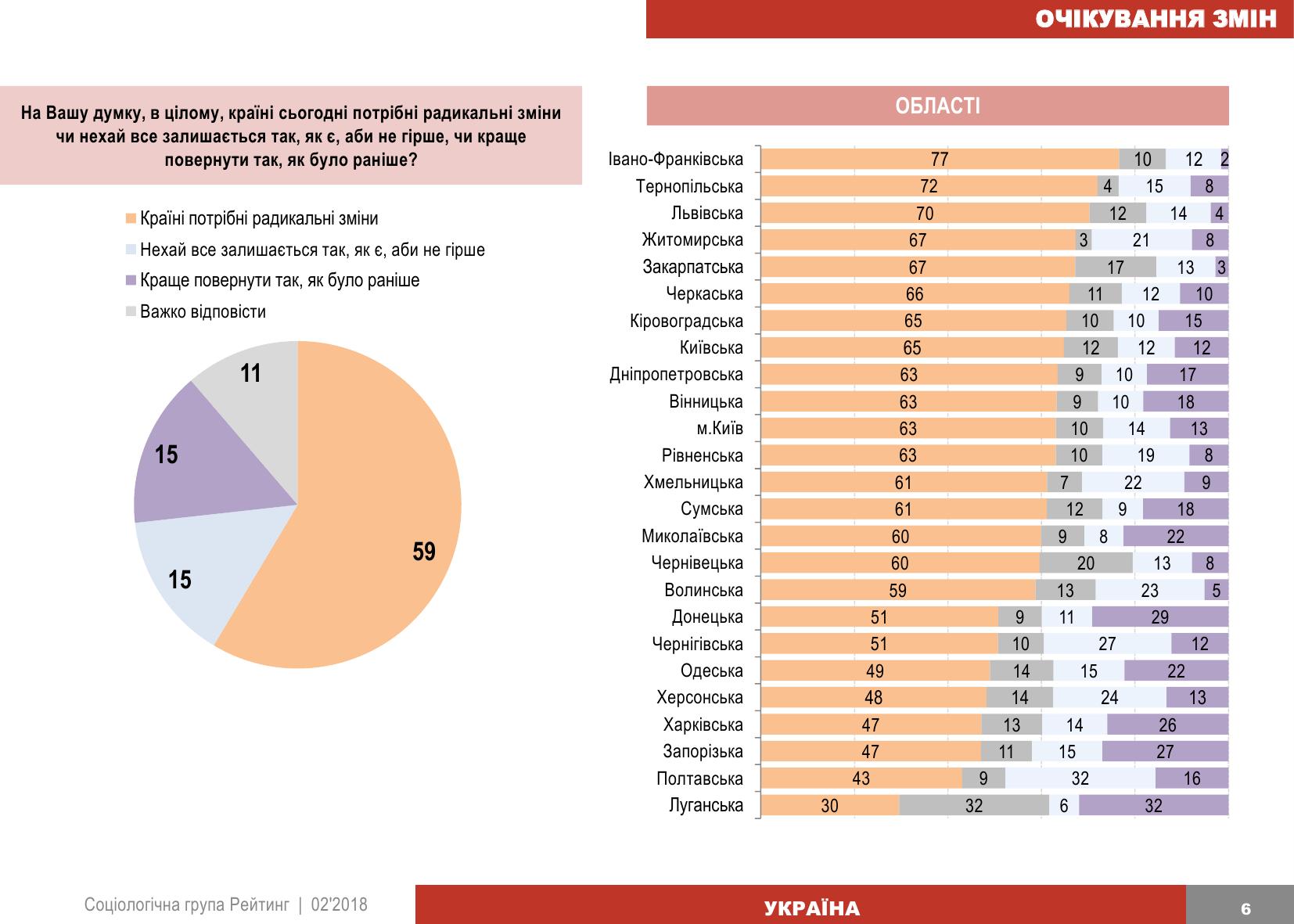 Большинство граждан Украины (59%) считают, что стране нужны радикальные изменения, свидетельствуют данные опроса Социологической группы "Рейтинг".