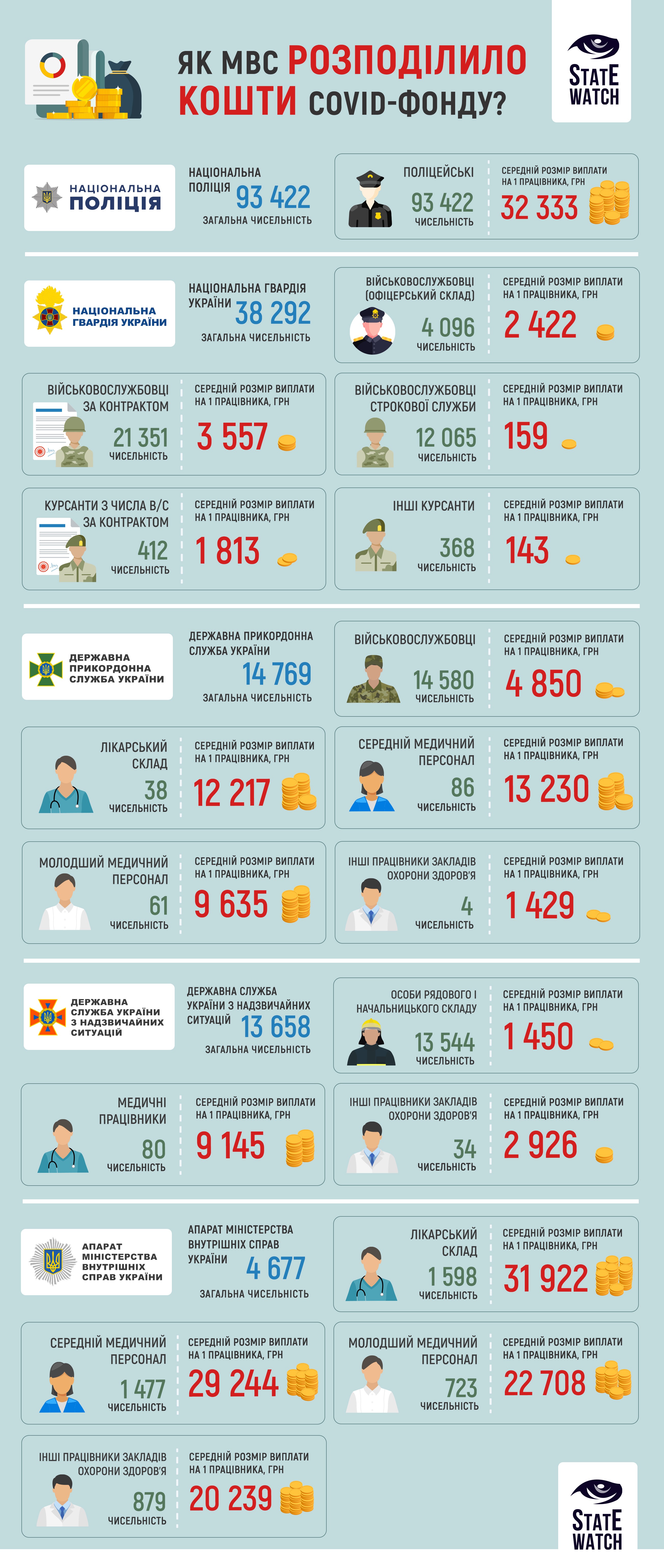 Лидером по численности работников, получивших доплаты и по среднему размеру выплат на работника стала Национальная полиция Украина. Согласно исследованию доплаты получили 93 422 работника, а средний размер выплаты на одного человека составлял 32 333 грн.