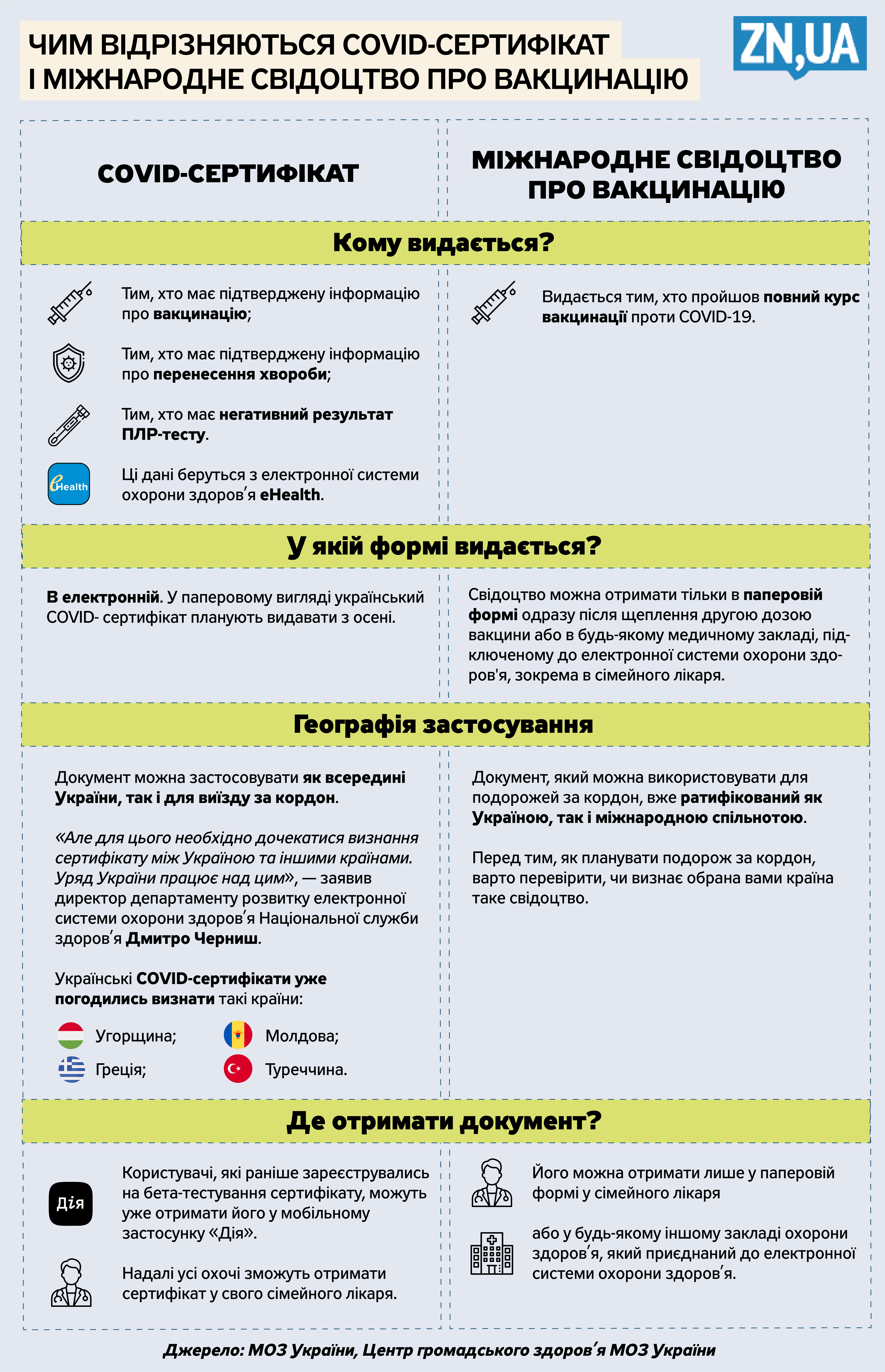 Документ можно применять как внутри Украины, так и для выезда за границу. «Но для этого необходимо дождаться признания сертификата между Украиной и другими странами. Правительство Украины работает над этим», - уточнил Черныш. Украинские COVID-сертификаты уже согласились признать Венгрия, Греция, Молдова и Турция.
