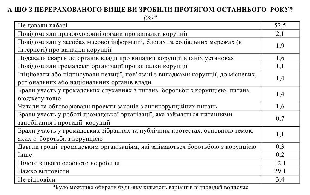 Однако, отвечая на вопрос о том, что лично они делали в течение года, 52% ответили, что не давали взятки, и около 2% - совершали какие-то реальные шаги.