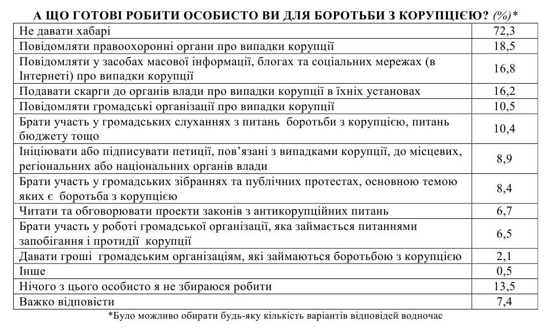 Большинство граждан Украины (72%) считают, что в деле борьбы с коррупцией они лично должны не давать взятки, 19% - уведомлять правоохранительные органы о случаях коррупции, 16% - сообщать в СМИ и соцсетях о случаях коррупции, 16% - подавать жалобы в органы власти, свидетельствуют данные опроса фонда "Демократические инициативы" и Центра Разумкова.