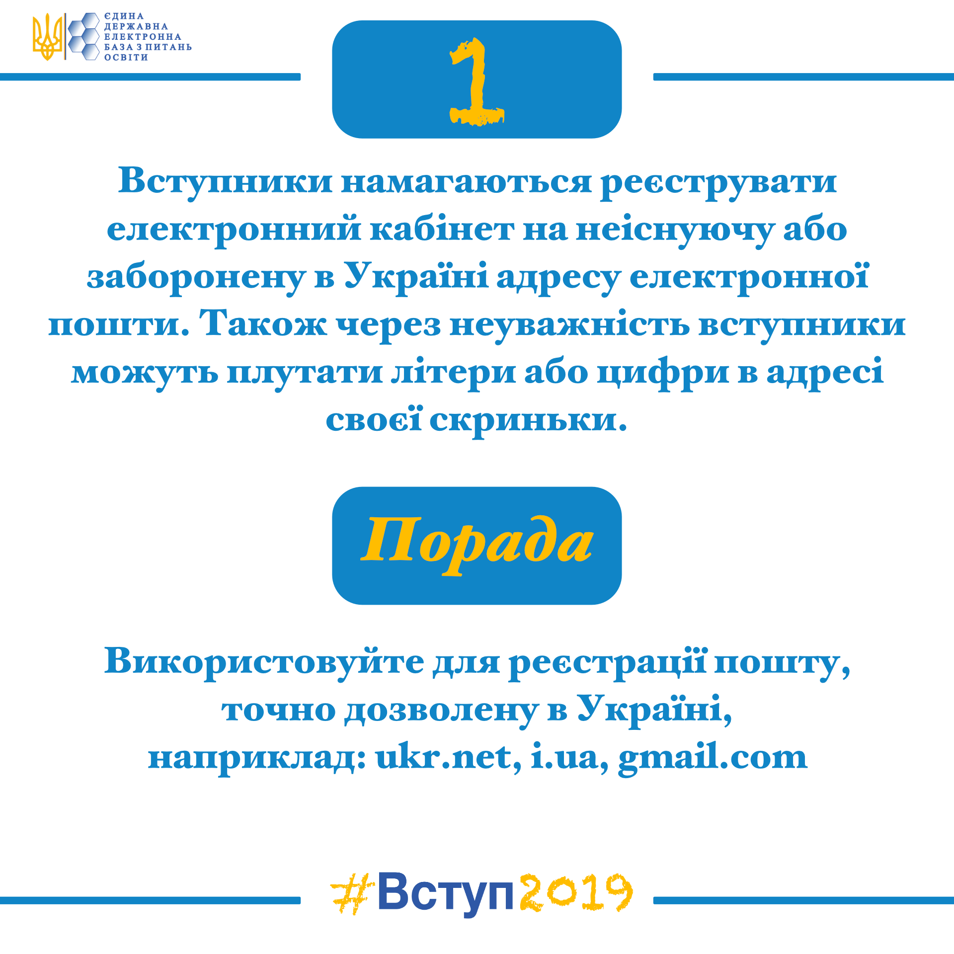 1. Абитуриенты пытаются регистрировать электронный кабинет на несуществующий или запрещенный в Украине адрес электронной почты. Также абитуриенты могут путать буквы или цифры в адресе своей почты. Используйте для регистрации почту, точно разрешенную в Украине, например: ukr.net, i.ua, gmail.com.