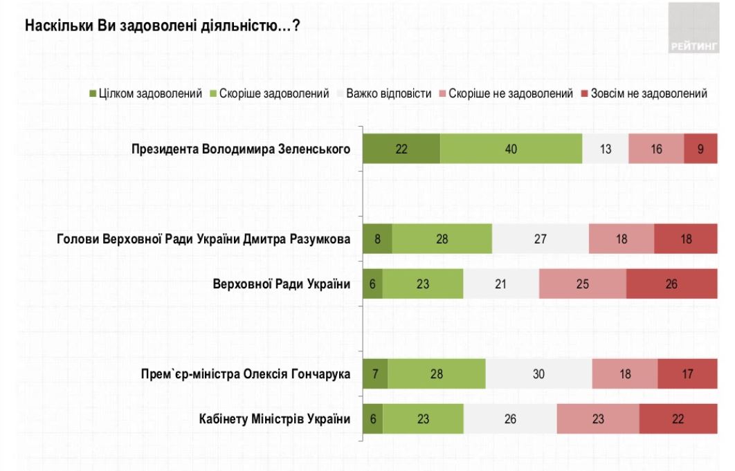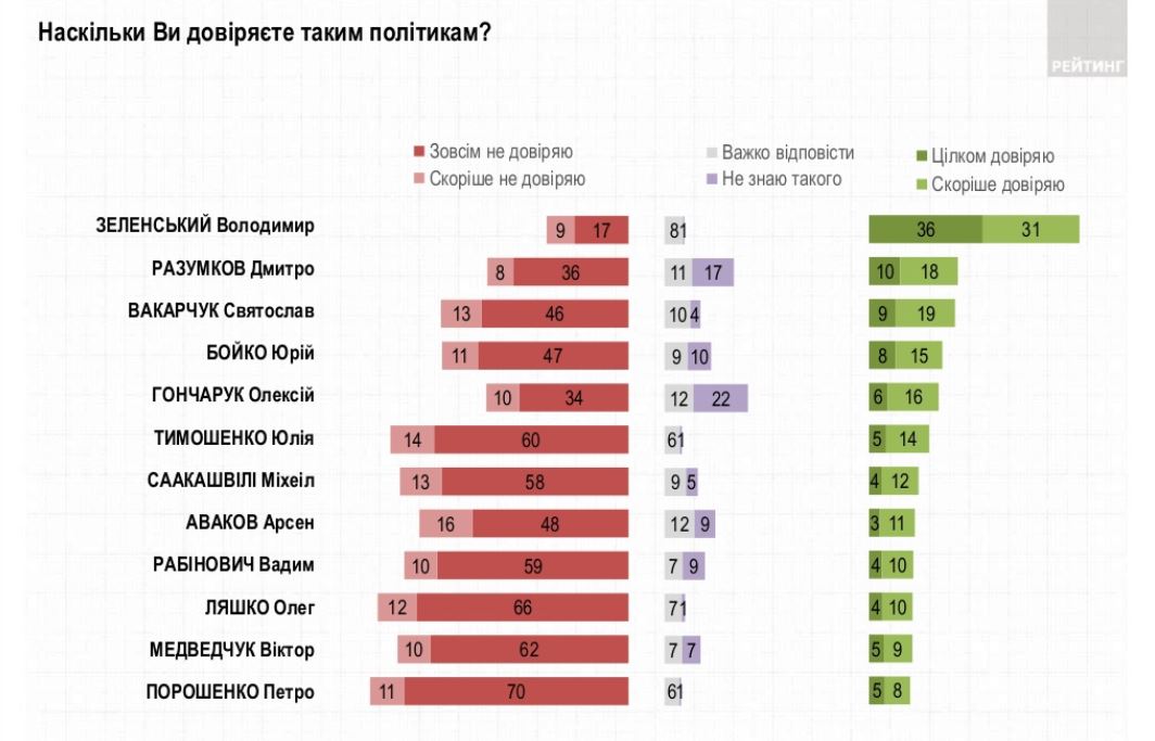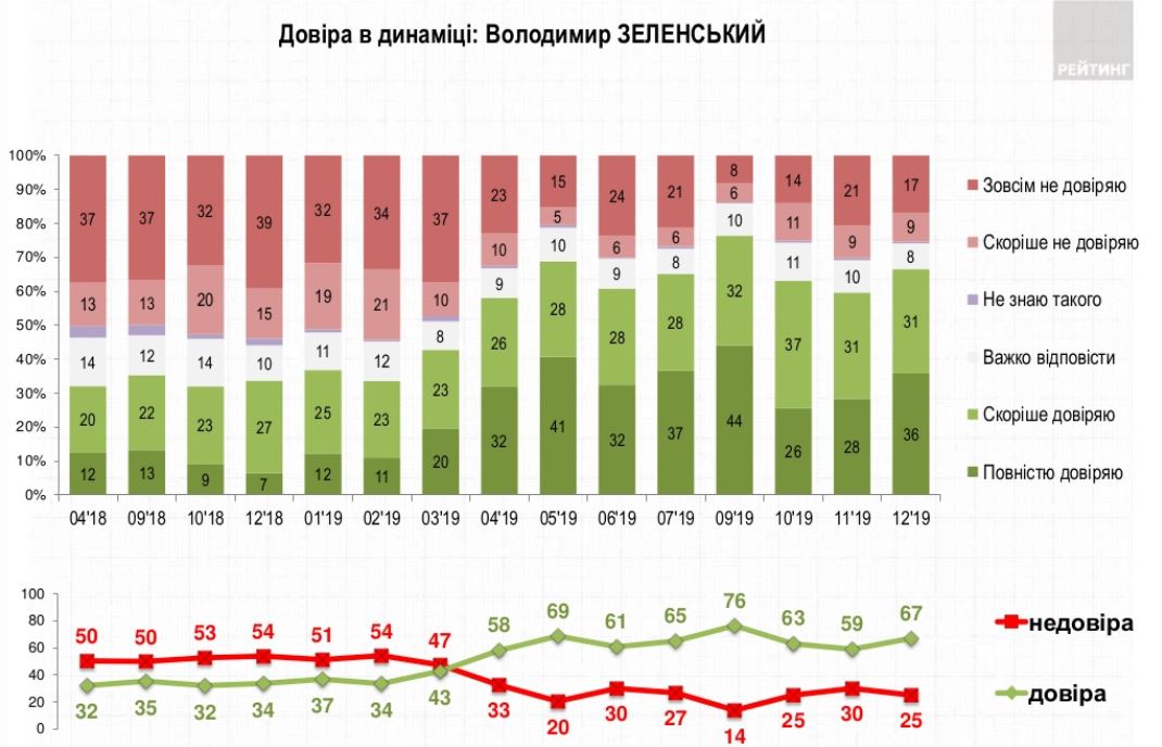 Президент Зеленский также продолжает возглавлять рейтинги доверия украинцев. Ему доверяют 67% опрошенных и не доверяют 25%.