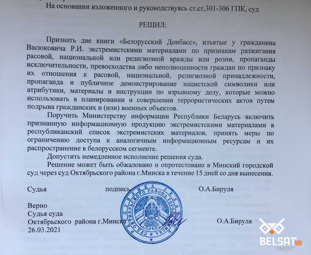 Фотокопию судебного решения опубликовал «Белсат». Судя по содержанию документа, суд усмотрел в книге «разжигание расовой, национальной или религиозной вражды и розни, пропаганду исключительности, превосходства либо неполноценности граждан по признаку их отношения к расовой, национальной, религиозной принадлежности, пропаганду и публичное демонстрирование нацистской символики или атрибутики, материалы и инструкции по взрывному делу, которые можно использовать в планировании и совершении террористических актов».